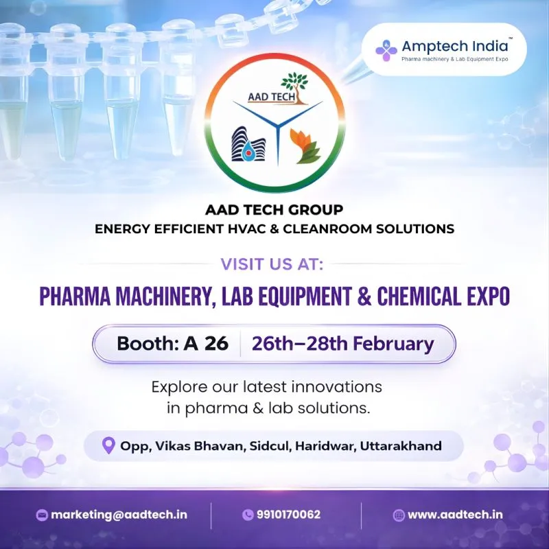 AAD Tech Group is excited to participate in the Amptech India – Pharma Machinery & Lab Equipment Expo, where we will present our advanced, energy-efficient HVAC and cleanroom solutions tailored for the pharmaceutical, laboratory, and chemical industries. Designed to enhance operational performance while minimizing energy consumption, our systems support sustainable and compliant environments for critical applications. Visit us in Haridwar from 26th to 28th February at Booth A26 to explore innovative technologies, connect with our experts, and discover how our solutions can add value to your facility.
